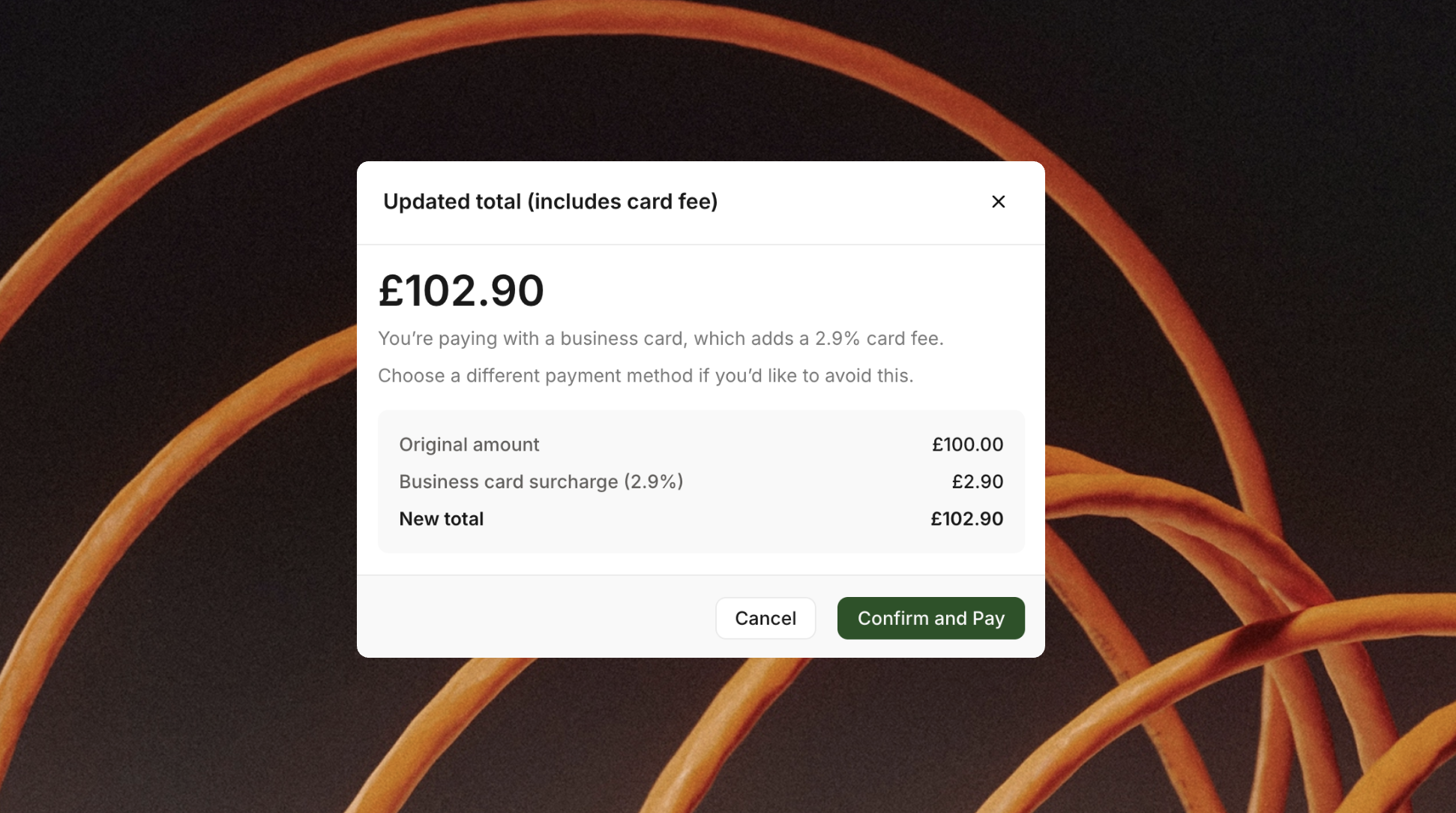 - Under UK law, only business cards can be surcharged – we automatically detect business cards and add the surcharge amount